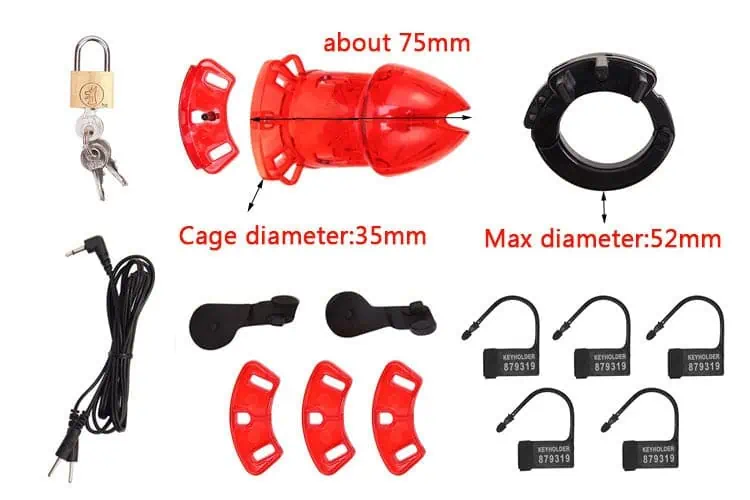 1 cage de chasteté 1 anneau réglable 1 boitier d’élèctro-stimulation (2 piles AAA non livrées) 1 télécommande sans fil 2 électrodes 3 entretoises 6 cadenas (1 en laiton + 5 en plastique) |